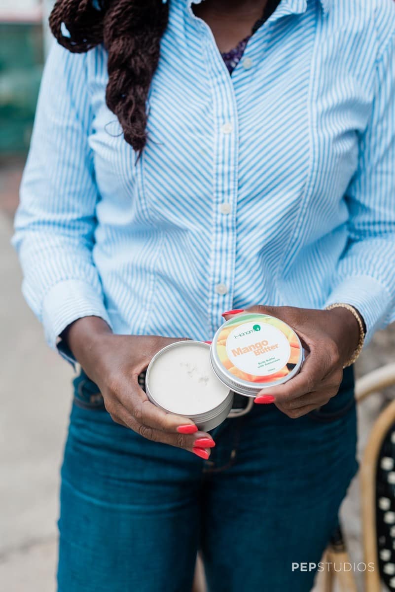 While still working in property management from 9 to 5, Naana creates her products in the evenings. She imports the shea and cocoa butters directly from Ghana and she sources the raw ingredients from a local wholesaler specializing in high quality organic products (olives from Italy, mangoes from India). Then, she just fluffs up the butters at home using only her Kitchen Aid mixer; “I can make everything with it!” she exclaims. To stay efficient, she keeps the production process simple and gets some help from her family. Her niece and her grandchild lend her a hand with the production sometimes, and her son creates the labels for the brand.